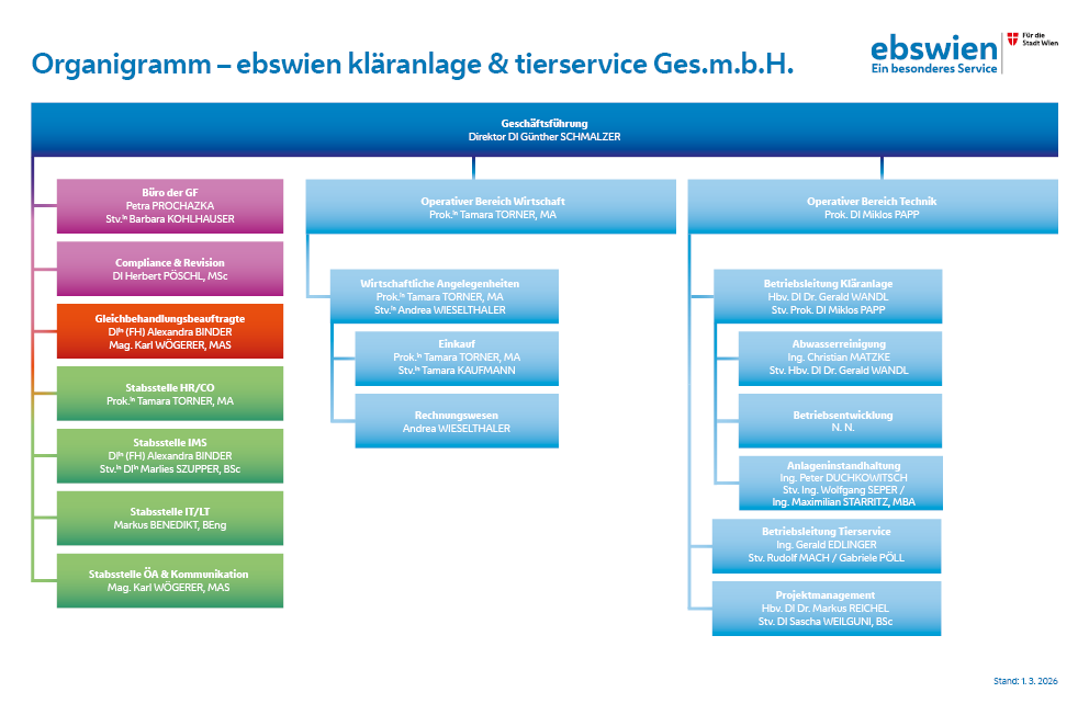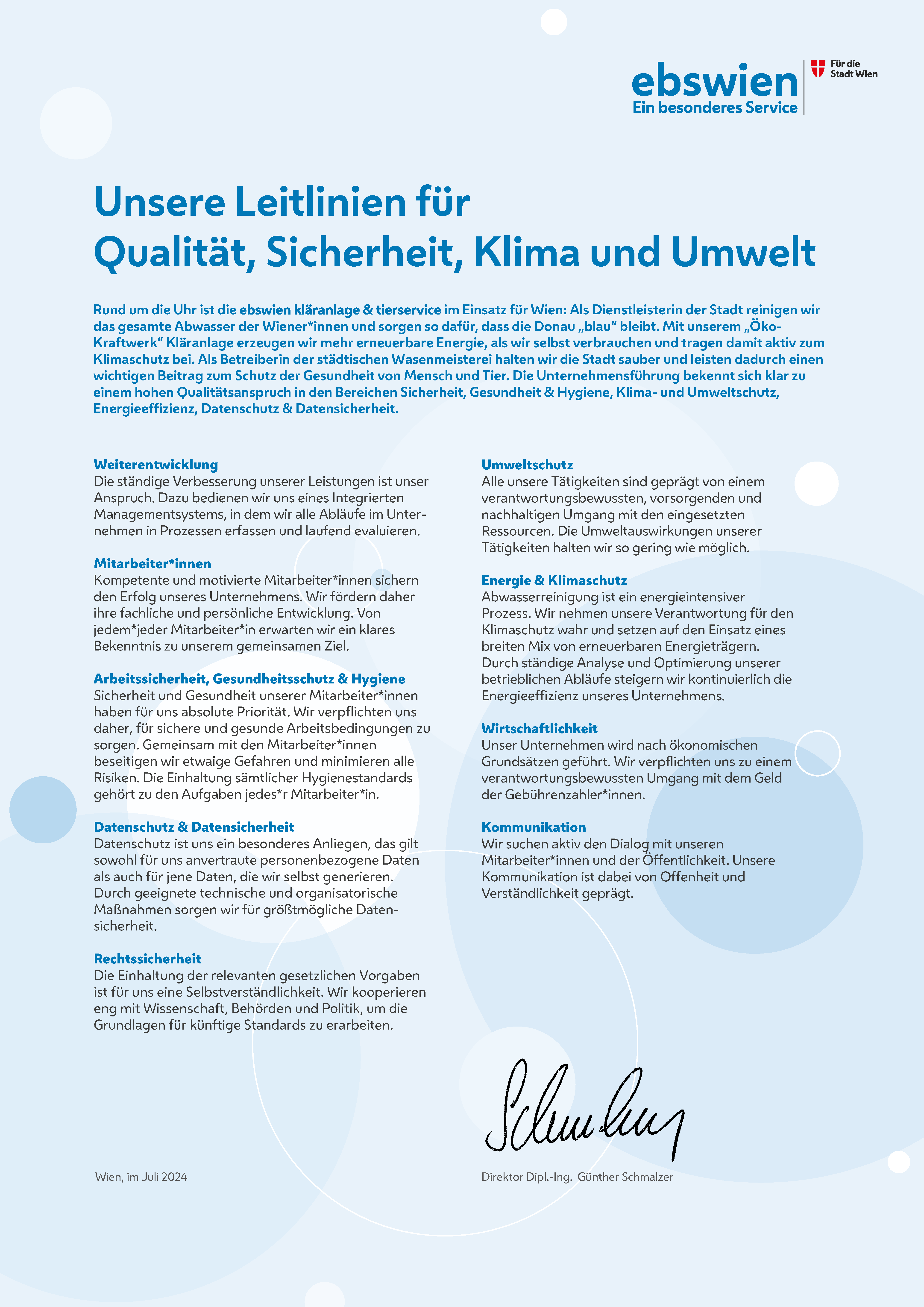 Rund um die Uhr ist die ebswien kläranlage & tierservice im Einsatz für Wien: Als Dienstleisterin der Stadt reinigen wir das gesamte Abwasser der Wienerinnen und Wiener und sorgen so dafür, dass die Donau „blau“ bleibt. Mit unserem „Öko-Kraftwerk“ Kläranlage erzeugen wir mehr erneuerbare Energie, als wir selbst verbrauchen und tragen damit aktiv zum Klimaschutz bei. Als Betreiberin der städtischen Wasenmeisterei halten wir die Stadt sauber und leisten dadurch einen wichtigen Beitrag zum Schutz der Gesundheit von Mensch und Tier. Die Unternehmensführung bekennt sich klar zu einem hohen Qualitätsanspruch in den Bereichen Sicherheit, Gesundheit & Hygiene, Klima- und Umweltschutz, Energieeffizienz, Datenschutz & Datensicherheit.